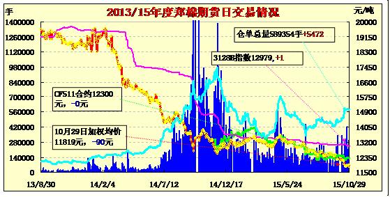 10月29日,隔夜鄭棉CF1601、1605合約沖高回落,今日早盤探低后在多頭買盤與空回補(bǔ)支撐下走高,日線形成長(zhǎng)下影線的陽(yáng)線星,日內(nèi)成交量放大,持倉(cāng)量近減遠(yuǎn)增。基本面情況:目前內(nèi)地棉紡織廠、棉花經(jīng)營(yíng)商多以觀望為主,皮棉滯銷導(dǎo)致很多棉企資金緊張,急于出貨變現(xiàn)的大有人在,因此皮棉報(bào)價(jià)非?;靵y。南疆巴楚、麥蓋提和阿克蘇沙雅、柯坪等地2127級(jí)(馬值C2)皮棉既有12800-12900元/噸的報(bào)價(jià),也有12500-12600元/噸的出貨價(jià),3128級(jí)(強(qiáng)力28CN及以上,馬值B2)的皮棉既有12800-13000元/噸的報(bào)價(jià),也有12500-12600元/噸的出貨價(jià)。而北疆3128級(jí)機(jī)采棉的差價(jià)也很大,博樂、塔城、精河等地僅12000-12300元/噸,而奎屯、石河子、昌吉等地3128級(jí)機(jī)采棉的報(bào)價(jià)則12500-12600元/噸提貨(均為毛重)。庫(kù)爾勒棉區(qū)2126、3126級(jí)(27mm以下長(zhǎng)度占比30%以上)毛重提貨價(jià)僅為12000-12300元/噸。