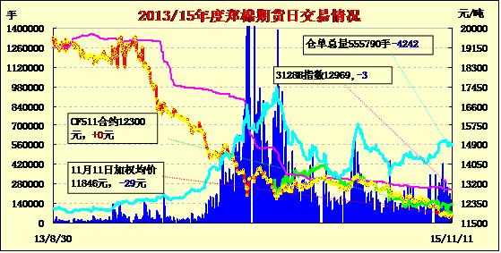 11月11日,隔夜鄭棉CF1601、1605合約探低回升,今日盤中橫向震蕩,日線形成小陰線,日內(nèi)遠(yuǎn)月成交量萎縮,持倉(cāng)量減少?;久媲闆r:由于中期花交售量逐漸下滑,霜期花、黃染棉的上市量不斷增長(zhǎng),而40衣分、13%以內(nèi)水分的籽棉收購(gòu)價(jià)仍“堅(jiān)守”在5.60-5.70元/公斤,巴楚、西大橋仍有少數(shù)軋花廠40衣分籽棉收購(gòu)價(jià)在5.75-5.80元/公斤。南疆部分棉企一方面嚴(yán)控籽棉收購(gòu)標(biāo)準(zhǔn),特別是纖維長(zhǎng)度低于27mm拒收;另一方面抓緊加工、入庫(kù)公檢并移庫(kù)至內(nèi)地市場(chǎng),11月20日前預(yù)計(jì)將有20%-30%的棉企止收購(gòu),11月底前全部加工結(jié)束。