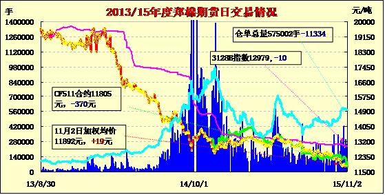 11月2日,隔夜鄭棉CF1601、1605合約調整后回升,今日早盤沖高回落,隨后區(qū)間震蕩,尾盤收高,CF1601合約日線形成長下影線的陰線,CF1605合約形成長下影線的陽線,日內(nèi)成交量放大,持倉量近增遠減。 相關市場情況:上周五ICE棉花期貨上漲?;久媲闆r:南疆皮棉等級和品質較伏前桃大幅提高,10月下旬以來陸續(xù)有一些內(nèi)地棉紡織廠、棉花經(jīng)營商和絮棉客戶到巴楚、阿克蘇及庫爾勒等地監(jiān)管庫和軋花廠內(nèi)看貨、詢價,疆內(nèi)站臺成交雖然仍很疲軟,但從買賣雙方的心理預期和市場表現(xiàn)看,新疆棉需求現(xiàn)觸底反彈。10月30-11月1日,阿克蘇站臺2128、3128級的毛重提貨報價分別為12900-13000元/噸、12700-12800元/噸,“21”和“31”級差價僅100元/噸左右,均較10月下旬有50-100元/噸的上調,3127級報價12300-12500元/噸(26mm及以下占比低于20%),3126級報價12000-12200元/噸。一些棉企表示,今年皮棉現(xiàn)貨市場將呈現(xiàn)“冷熱不均”現(xiàn)象,3128、2128級及以上等級棉花將供不應求,而2127、3127級及以下等級棉的棉花將泛濫成災,“賣棉難”成為常態(tài)。