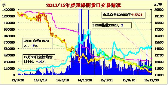 12月30日,隔夜鄭棉橫向震蕩,今日盤中小幅下滑,午后增倉下跌,尾盤在短線回補(bǔ)推動(dòng)下反彈,CF1605合約日線形成小陰線,CF1609合約日線形成陽線星,日內(nèi)成交量變化不大,持倉量增加?;久媲闆r:今年枝江、天門一些大廠在市場(chǎng)需求旺盛期集中迅速出貨,主流成交價(jià)在12600-12700元/噸(級(jí)別以31/1228B2為主),目前停收后,廠內(nèi)皮棉庫存極少,后期只等“售完過年”。而還有一些廠仍有部分庫存。潛江一大廠內(nèi)還有部分庫存,主體品級(jí)3128B2,斷裂比30以上,目前報(bào)價(jià)12850元/噸。盡管棉花等級(jí)較好,但多數(shù)紡企對(duì)于這個(gè)價(jià)格只能退避三舍。該廠皮棉價(jià)格一直堅(jiān)挺,其老板曾表示隨著后期省內(nèi)地產(chǎn)棉供應(yīng)下降,相信高等級(jí)棉花價(jià)格會(huì)走高,但隨著年底紡企紗線出貨、回款難,期貨震蕩低迷,這一趨勢(shì)尚未能得到市場(chǎng)響應(yīng)。此外,淡點(diǎn)污一或二級(jí)、長(zhǎng)度27mm、馬值B2/C2的皮棉某廠報(bào)價(jià)12400-12500元/噸,由于廠家希望現(xiàn)款現(xiàn)結(jié),所以寧愿多等等也不愿給紡織廠欠款發(fā)貨。