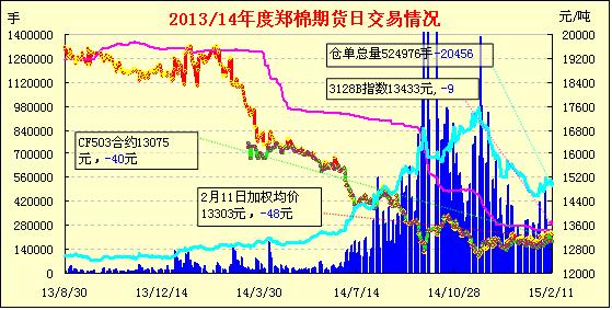 2月11日,隔夜鄭棉CF1505合約低開高走,今日早盤窄幅震蕩,日線形成1/2上影線的陽線,日內(nèi)成交量變化不大,持倉量減少?;久媲闆r:由于2014年度國家取消了實(shí)施3年的棉花臨時收儲政策,在國內(nèi)棉價逐步向國際棉價靠攏的過程中使得2014年籽棉收購價格較前幾年大幅走低,宿松縣籽棉平均收購價格只在3.00-3.10元/斤,每斤籽棉價格比上一年要減少1塊多,有少數(shù)棉農(nóng)惜售,將籽棉存放在家里等春節(jié)后行情上漲時再賣??山衲晗掳肽晏鞖猱惓8稍铮由涎蚰甏汗?jié)越來越近,煙花炮竹燃放頻繁,存放在家中的籽棉存在很大安全隱患。