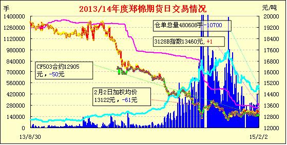2月6日,隔夜鄭棉CF1505合約上試回落,今日早盤窄幅震蕩,日線形成陽線星,日內(nèi)成交量萎縮,持倉量減少。基本面情況:據(jù)江浙、河南和山東等的棉紡織企業(yè)反映,2014/15年度新疆棉棉花品級(jí)普遍比較高,2128(2129)、1128(1129)的占比很大。紡織企業(yè)反饋,南疆軋花廠手采棉的主要缺點(diǎn)是馬值較大、棉纖維長度較短、“三絲”問題,以及因籽棉收購水份大造成加工后皮棉雜質(zhì)較往年大,相對(duì)港口C/A SM、EMOT SM、SM級(jí)澳棉而言,“三絲”和“一致性”問題是最大短板。另外各方也認(rèn)為新疆棉同清關(guān)后高等級(jí)美棉的差價(jià)有些過大,2、3月份將有所修正。