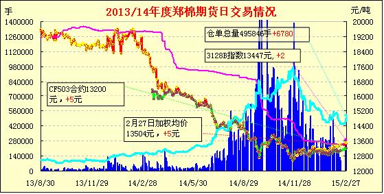 2月27日,隔夜鄭棉CF1505合約平開(kāi)震蕩,今日早盤(pán)在多頭買(mǎi)盤(pán)推動(dòng)下沖高,隨后區(qū)間震蕩,尾盤(pán)在多頭平倉(cāng)壓制下快速下滑,日線(xiàn)形成小陽(yáng)線(xiàn),日內(nèi)成交量萎縮,持倉(cāng)量變化不大?;久媲闆r:春節(jié)七天假期結(jié)束,但安徽池州的大小棉花企業(yè)仍無(wú)開(kāi)秤,年前加工的皮棉和棉籽、短絨也無(wú)客戶(hù)訂貨,整個(gè)市場(chǎng)仍處在有價(jià)無(wú)市之中。據(jù)了解,截止2月27日,當(dāng)?shù)氐淖衙奘召?gòu)報(bào)價(jià)依舊保持節(jié)前報(bào)價(jià),3級(jí)為3.10元/斤左右(衣分39.5%、水分12%、雜質(zhì)1.3%),4級(jí)為3.00元/斤左右,棉販的報(bào)價(jià)也保持在2.95元/斤左右。3級(jí)皮棉報(bào)價(jià)為13000元/噸(提貨、帶票、現(xiàn)金),4級(jí)為12700元/噸。小包棉3級(jí)為12700元/噸,4級(jí)12300元/噸。