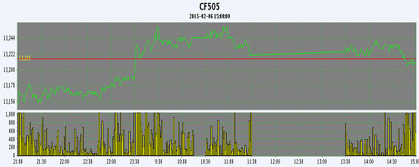2月6日,隔夜鄭棉CF1505合約上行,今日早盤繼續(xù)沖高,隨后在多頭平倉壓制下盤整,尾盤在周末平倉盤打壓下小幅收低,日線形成小陽線,日內(nèi)成交量萎縮,持倉量變化不大?;久媲闆r:2月初以來河南、山東、江蘇等地新疆棉報(bào)價(jià)趨于穩(wěn)定,個(gè)別廠家手采棉報(bào)價(jià)隨ICE、鄭州期貨略有50-100元/噸的反彈,但由于大中型紡企春節(jié)前原料補(bǔ)庫較少,中小企業(yè)又紛紛提前放假,再加上新疆棉企大多只肯“現(xiàn)款現(xiàn)貨”銷售,賒貨欠帳的現(xiàn)象比較少,因此活躍程度低于黃河流域地產(chǎn)棉。