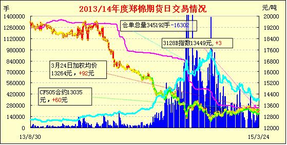 3月24日,隔夜鄭棉CF1505合約上漲,今日早盤沖高后在平倉盤壓制下走低,日線形成陽線星,日內(nèi)成交量變化不大,持倉量繼續(xù)減少。CF1509合約夜盤上漲,今日早盤沖高下滑,盤中空頭打壓期價(jià)增量走低,日線形成長上影線的陽線星,日內(nèi)成交量變化不大,持倉量增加?;久媲闆r:近兩天安徽池州的天氣非常好,陽光明媚 ,氣溫在9-19攝氏度之間,對(duì)籽棉收購和籽棉加工非常有利。目前當(dāng)?shù)氐淖衙奘召弮r(jià)格基本沒變,質(zhì)量好的價(jià)格為3.08元/斤,衣分40%、水分12%、雜質(zhì)1.3%,質(zhì)量差的暫時(shí)不收。棉販下鄉(xiāng)收購價(jià)格為2.80元/斤。棉花企業(yè)的日收購量在4萬斤左右。
