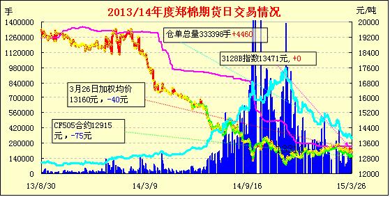 3月26日,隔夜鄭棉CF1505合約區(qū)間震蕩,今日早盤探低回升,日線形成長(zhǎng)下影線的陰線,日內(nèi)成交量萎縮,持倉(cāng)量減少。CF1509合約夜盤回升震蕩,今日早盤下探后在多頭買盤支撐下回升,此后窄幅整理,日線形成星線,日內(nèi)成交量放大,持倉(cāng)量增加?;久媲闆r:北疆博爾塔拉地區(qū)的博樂市、農(nóng)五師、精河縣等地棉企銷售工作正在緊鑼密鼓地進(jìn)行。被調(diào)查企業(yè)2014年皮棉加工總量為14.3萬(wàn)噸,其中機(jī)采棉為12.5萬(wàn)噸,占總加工量87.41%,手摘棉相對(duì)量較小,且已基本完成銷售計(jì)劃。目前庫(kù)存10.5萬(wàn)噸為機(jī)采棉,占總加工量73.43%。就目前銷售情況來看,已售的3.8萬(wàn)噸當(dāng)中,88.16%銷往內(nèi)地,主要集中在河南、江蘇、山東等地,價(jià)格在13500元/噸左右。