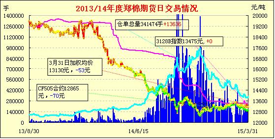 3月31日,隔夜鄭棉CF1509合約橫向震蕩,今日盤中在空頭增倉(cāng)打壓下震蕩下滑,日內(nèi)成交量變化不大,持倉(cāng)量近減遠(yuǎn)增。基本面情況:據(jù)阿拉爾市一棉農(nóng)反饋,今年播種要比去年提前4天左右,去年是在4月19日開始播種的,因?yàn)樗牡厥怯玫叵滤畞?lái)灌溉,目前還在上水階段,等結(jié)束后就會(huì)立刻開始播種。因?yàn)樽獾氐南拗?,今年棉花還是采用直播的模式。租地的費(fèi)用沒(méi)有變化還是500元/畝,但是種子和化肥都就較去年上漲了一倍,好一點(diǎn)的種子要在40-50元/斤,有的甚至要80/斤,去年的種子是在30元/斤,她坦言,現(xiàn)在的種子市場(chǎng)太過(guò)混亂,市面上所謂的衣分率其實(shí)并不完全準(zhǔn)確,不斷上漲的價(jià)格也讓她不知怎么挑選。對(duì)于她一個(gè)從內(nèi)地來(lái)新疆種植棉花的農(nóng)民來(lái)說(shuō),良好的收益無(wú)疑是她最盼望的,但目前上漲的農(nóng)資成本,補(bǔ)貼又遲遲沒(méi)有到位,多少打擊了她的信心。不過(guò),她表示,還是希望2015年的目標(biāo)價(jià)格補(bǔ)貼政策盡早出臺(tái)。