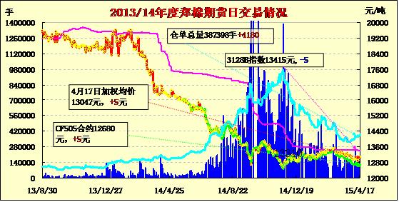 4月17日,隔夜鄭棉CF1509合約上漲,今日早盤沖高回落,今日早盤探低后在空頭回補(bǔ)和多頭買盤支撐下回升,午后重心上移至夜盤平臺(tái)一線,日線形成陰線星,日內(nèi)成交量萎縮,持倉(cāng)量增加。基本面情況:目前安徽池州方圓幾十里,尚沒發(fā)現(xiàn)種植5畝以上的棉農(nóng),基本面積都在3畝左右,比去年都縮種近半,棉農(nóng)擔(dān)心去年的棉花種植補(bǔ)貼能不能發(fā)放到手,棉農(nóng)都在期盼著,還有的棉農(nóng)雖然買了棉種但還是舉棋不定要不要種,棉種仍放在家里睡大覺。近期期貨價(jià)格震蕩不定,市場(chǎng)不確定因素不可預(yù)計(jì),有庫(kù)存的企業(yè)都在積極出貨,紛紛下調(diào)了皮棉價(jià)格,但由于下游買家的不積極,成交不能放量,每次成交只在20噸左右。