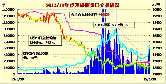 4月29日,隔夜鄭棉CF1509合約調(diào)整后回升,今日早盤在多頭買盤推動下沖高,午后在多頭平倉盤打壓下走低,尾盤受到空頭回補支撐反彈,日線形成長上影線的陰線,日內(nèi)成交量放大,持倉量增加?;久媲闆r:隨著市場資源地消耗,部分棉花企業(yè)對高等級質(zhì)量皮棉產(chǎn)生惜售心理,欲提價進行銷售,但難度較大。據(jù)分析,制約棉花上漲的主要原因有以下幾點:一是疆棉陸續(xù)進入內(nèi)地市場,紡織企業(yè)原材料選擇性多,紡企自身受資金周轉(zhuǎn)困難影響,極力壓低價格進行采購工作;二是新疆棉企面臨還貸壓力,低價格進行促銷的企業(yè)占有一定比例,拉低市場價格;三是市場機采棉價格較低,部分紡織企業(yè)采購機采棉用于配棉工藝。