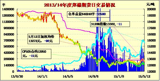 5月12日,隔夜鄭棉CF1509合約沖高回落,今日早盤窄幅震蕩,尾盤收低,日線形成低開陰線,日內成交量放大,持倉量減少。基本面情況:據(jù)自治區(qū)氣象臺預報,12日夜間,伊犁河谷、北疆沿天山一帶、天山山區(qū)和塔城、阿勒泰、南疆西部山區(qū)等地的部分地區(qū)有小雨,局部有大到暴雨;13~14日,伊犁河谷、南疆西部、阿克蘇等地的部分地區(qū)有小雨,局部有中到大雨,伴有4~5級西北風,南疆東部有4~5級偏東風,南疆盆地的部分地區(qū)伴有揚沙或浮塵;18日前后,北疆大部、天山山區(qū)、南疆西部山區(qū)有微到小雨,局部有中到大雨。5月中旬降水量伊犁河谷、北疆沿天山一帶、天山山區(qū)略偏多,全疆其它地區(qū)略偏少。預計5月中旬氣象條件較有利于伊犁河谷棉區(qū)棉花立枯病的發(fā)生,全疆其余棉區(qū)棉花立枯病大面積發(fā)生的可能性較小,建議各棉區(qū)雨后及時中耕松土,北疆棉區(qū)對已出苗棉田做好查苗、放苗工作。