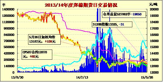 5月26日,隔夜鄭棉CF1509合約沖高,今日早盤區(qū)間震蕩,尾盤下滑,日線形長上影線的陽線,日內(nèi)成交量放大,持倉量減少。隔夜鄭棉CF1601合約震蕩上行,今日區(qū)間震蕩,尾盤下滑,日線形成1/2上影線的陽線,日內(nèi)成交量放大,持倉量減少。基本面情況:5月24、25日南疆2128(2129)、3128(3129)級監(jiān)管庫毛重提貨13400-13500/噸、13000-13300元/噸,長度28mm與29mm相差50-100元/噸,受鄭期CF1509跌破13000元/噸的影響,現(xiàn)貨報價也有50-100元/噸的回調(diào),買賣雙方的心理差價在200-300元/噸。阿克蘇一些加工企業(yè)表示,因監(jiān)管庫皮棉被買家多次挑選,“雙29”和高馬值、低雜質(zhì)的皮棉所剩無幾,采購商對皮棉指標的要求也相應下滑。