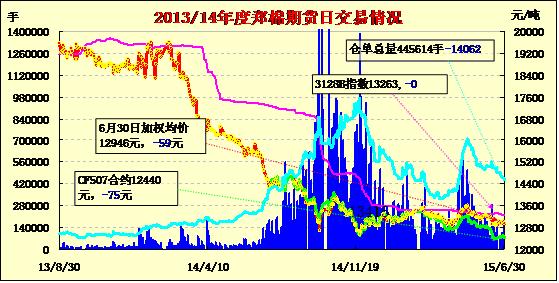 6月30日,隔夜鄭棉盤(pán)升橫向震蕩,今日盤(pán)中增倉(cāng)下行,午后增倉(cāng)回升,日線形成1/2下影線的小陰線,日內(nèi)成交量萎縮,持倉(cāng)量減少?;久媲闆r:在中儲(chǔ)棉漯河庫(kù)了解,近日移庫(kù)至漯河的新疆棉較多,也在陸續(xù)出貨,但走貨較多的應(yīng)該是期貨倉(cāng)單,庫(kù)里正騰出庫(kù)容存放期貨倉(cāng)單棉。據(jù)了解,近日鄭棉1509成交價(jià)多在12700-12800元/噸之間,加上升貼水,2228級(jí)地產(chǎn)棉成交價(jià)多在12500元/噸左右,相比現(xiàn)貨價(jià)格頗有優(yōu)勢(shì)。在湖北武漢某倉(cāng)儲(chǔ)庫(kù)也同樣存在這種現(xiàn)象,該庫(kù)某負(fù)責(zé)人透露,“最近出貨最多的要算倉(cāng)單棉,多的時(shí)候一天能出7、8車(chē),所以倉(cāng)單棉庫(kù)存信息變化也較快。”