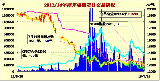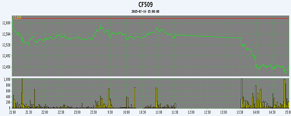 7月14日,隔夜鄭棉震蕩,今日早盤上行,午后在空頭賣盤打壓下快整下滑,日線形成陰線,日內成交量放大,持倉量增加。