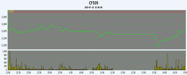 7月15日,隔夜鄭棉反彈,今日早盤在空頭賣盤壓制下回落,隨后在空頭回補支撐下脫離低點,日線形成陰線,日內成交量萎縮,持倉量增加。