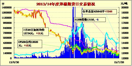 7月28日,隔夜鄭棉回升,今日盤中窄幅震蕩,尾盤在多頭買盤推動下沖高,日線形成小陽線,日內(nèi)成交量放大,持倉量增加?;久媲闆r:雖然今年新棉長勢較去年稍好,但是7月份新疆高溫天氣持續(xù)不下,干旱、蟲害等不利因素都對棉花產(chǎn)量造成影響,該棉農(nóng)認(rèn)為長絨棉單產(chǎn)可能較去年有所下降,約在300多公斤/畝,目前,棉農(nóng)最關(guān)心的就是今年籽棉收購價,如果籽棉收購價低于8元/公斤,那么就可能會有虧損的危險。