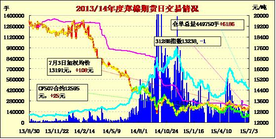 7月3日,隔夜鄭棉盤升,盤中增倉調(diào)整,日線形成1/2上影線的陽線,日內(nèi)成交量放大,持倉量增加。基本面情況:據(jù)南疆阿克蘇、庫爾勒等地的棉花企業(yè)反映,因猜測(cè)7月10日前后或?qū)?zhí)行100萬噸“輪儲(chǔ)”,再加上C40S及以上高支紗、精梳紗訂單呈現(xiàn)疲軟回落的趨勢(shì),內(nèi)地棉紡織企業(yè)、經(jīng)營(yíng)商對(duì)高等級(jí)南疆手采棉的詢價(jià)、提貨明顯減緩,有的紡企前期簽訂的采購合同也暫緩執(zhí)行,有的則簽了10批棉花,只提1-2批滿足近一周生產(chǎn)。7月1、2日疆內(nèi)皮棉的詢價(jià)、成交幾乎陷于停滯狀態(tài)。