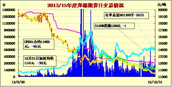 12月31日,隔夜鄭棉調(diào)整后回升,今日盤中窄幅震蕩,日線形成陰線星,日內(nèi)成交量萎縮,持倉量近減遠增?;久媲闆r:河南、山東、江蘇等地的棉紡織廠表示,2015年度新疆棉花受天氣、品種等因素影響,單批次品質(zhì)差異比較大,長度從27mm-30mm(有的批次甚至26mm至31mm),馬克隆值C2/B2/B1/A,斷裂比強度S1-S4,紡企在采購時比較頭痛,特別是紡C40S及以上高支紗訂單,如何保證紗線品質(zhì)穩(wěn)定、差異小是關(guān)鍵。雖然北疆兵團3128B級的機采棉內(nèi)地庫公定結(jié)算報價12800-12900元/噸,折合毛重價格約13100-13200元/噸,與地方棉企“雙28”“雙29”手摘棉的價格基本一致,雖然顏色級、纖維長度稍差一些,但馬值、強力有優(yōu)勢;北疆地方棉企機采棉雖然報價低于兵團300-400元/噸,但雜質(zhì)大、三絲含量高,纖維品質(zhì)差異大,實際紡紗成本并不低;而兵團手摘棉報價高于地方棉企400-500元/噸,棉紡織廠接受并消化難度較大。