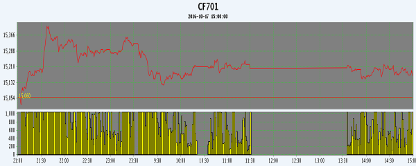 10月17日,隔夜鄭棉CF1701合約沖高盤整,今日早盤在多頭平倉打壓下走低,隨后低位震蕩,日線形成1/2上影線的陽線。日內(nèi)成交量放大,持倉量增加?;久媲闆r:在巴州尉犁縣的道路兩旁,盛放著金燦燦的胡楊林和潔白待摘的棉花,處處是美景和豐收的喜悅。尉犁縣是傳統(tǒng)的產(chǎn)棉大縣,種植面積在110萬畝左右,2015/16年度棉花產(chǎn)量在13-14萬噸左右,約占整個(gè)巴州地區(qū)的近1/3。2016/17年度種植面積基本略有調(diào)減,經(jīng)過品種改良,今年棉花單產(chǎn)普遍有所提升,大部分在340-380公斤/畝之間,不過一些品種衣分較低,因此預(yù)計(jì)棉花產(chǎn)量比去年持平或略低。今年棉花質(zhì)量也明顯優(yōu)于去年,長度基本都在28mm以上,29mm以上的占大半。