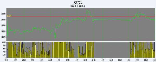 10月20日,隔夜鄭棉CF1701合約橫盤,今日早盤在平倉盤打壓下走低,隨后空頭集中回補推動期價上行,午后自高位下滑,日線形成小陽線。日內成交量萎縮,持倉量減少?;久媲闆r:據(jù)奎屯、精河、沙灣等地的棉花加工企業(yè)反饋,鄭期主力合約CF1701再次跌破15000元/噸心理支撐位,疆內籽棉收購價整體下滑0.40-0.50元/公斤,疆內外棉紡織廠與經營商對新棉的采購意愿也隨之大幅下滑。2128/2129級手采棉毛重報價已整體跌破16000元/噸,3128級機采棉買方報價低于15000元/噸,10月中旬前搶收搶購籽棉的軋花廠虧損范圍不斷拉大。