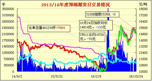 10月24日,隔夜鄭棉CF1701合約區(qū)間震蕩,今日早盤維持盤整走勢,午后在空頭賣盤打壓下走低,日線形成小陰線。日內(nèi)成交量萎縮,持倉量增加?;久媲闆r:24日,河北滄州籽棉價格再跌。當日,河間市某400型軋花廠收購價3.75-3.80元/斤(衣分40%,回潮率12%),較昨日跌0.05元/斤。200型軋花廠的收購價略低,在3.60-3.70元/斤,但是200型小廠一般對質(zhì)量要求不是十分嚴格。一般只要顏色級、纖維長度以及回潮率過得去就能夠收購。據(jù)企業(yè)反饋,籽棉價格下跌原因:第一,近期,新疆籽棉價格跌幅較大。其中,南疆阿克蘇、庫爾勒等地40%衣分手摘棉,價格7.0-7.3元/公斤,機采棉價格在6.30-6.40元/斤區(qū)間,較9月底下跌0.5-0.6元/公斤,較上周跌0.05-0.10元/公斤。由于籽棉價格下跌,致使不少軋花廠停收觀望,表示對行情看不懂;第二,籽棉集中上市,棉農(nóng)變現(xiàn)心理強烈。不少棉農(nóng)“賣跌不賣漲”,將家中所有籽棉打包運往軋花廠,表示只要給現(xiàn)錢,價格低些也不要緊。