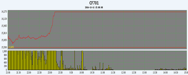 11月11日,隔夜鄭棉CF1701合約盤(pán)整后在多頭集中買盤(pán)推動(dòng)下沖擊漲停,今日牢牢封于漲停價(jià)位,日線形成長(zhǎng)陽(yáng)線。日內(nèi)成交量萎縮,持倉(cāng)量增加?;久媲闆r:現(xiàn)貨市場(chǎng)調(diào)整占據(jù)主導(dǎo),北疆機(jī)采棉現(xiàn)貨報(bào)價(jià)在15200-15500元/噸水平,地產(chǎn)棉3128級(jí)銷售在15200-15500元/噸,內(nèi)地庫(kù)疆棉價(jià)格在15800元/噸以上水平。而隨著近期期貨價(jià)格略回升,商家多積極期貨套保操作,新疆企業(yè)套保價(jià)格一般在15300-15550元/噸水平。