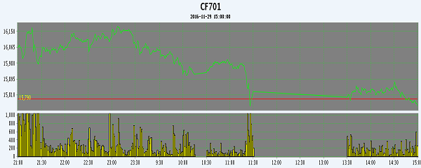 11月29日,隔夜鄭棉CF1701合約沖高,今日在平倉盤壓制下走低,日線形成陰線。日內(nèi)成交量放大,持倉量減少。 相關(guān)市場情況:周一ICE棉花期貨上漲。基本面情況:現(xiàn)貨報(bào)價(jià)增多價(jià)格松動(dòng),南疆監(jiān)管庫高價(jià)報(bào)價(jià)減少,3128級報(bào)價(jià)多在15500-15800元/噸毛重,商家出貨意向增濃,北疆雙29、雙30機(jī)采棉提貨報(bào)價(jià)也微降至15500-15800元/噸。而長絨棉市場相對維持穩(wěn)定,137級阿克蘇站臺提貨價(jià)20800元/噸毛重,237級在20000元/噸水平,實(shí)際成交有50-100元/噸優(yōu)惠。