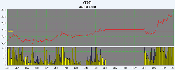 11月3日,隔夜鄭棉CF1701合約下探,今日早盤空頭回補推動下走高,午后多頭買盤繼續(xù)推高期價,日線形成陽線。日內(nèi)成交量萎縮,持倉量減少?;久媲闆r:據(jù)南疆地區(qū)軋花廠企業(yè)反應(yīng),11月2日籽棉收購價在7.1-7.3元/公斤,棉籽價格在2.5元/公斤。目前南疆地區(qū)棉花大部分為中期花,長度,馬值,斷裂比強度等綜合指標(biāo)較好,軋花廠企業(yè)收購價格有略微上調(diào)。部分“霜后花”“剝桃棉”由于品質(zhì)較差,軋花廠企業(yè)提供的價格會稍微低0.1-0.3元/公斤。自11月份以來,內(nèi)地紡織廠和貿(mào)易商詢價的增多,皮棉成交略增。據(jù)庫爾勒地區(qū)一家倉儲企業(yè)反應(yīng),近幾日,皮棉站臺提貨的企業(yè)增加。上周平均每日出貨量為2-4車(平均每車為30-32噸,汽運),目前皮棉出庫量為6-8車。庫爾勒一家軋花廠企業(yè)反應(yīng),最近紡企和貿(mào)易商詢價的增多,3128B皮棉成交價格在15400元/噸(毛重,站臺自提)。“大部分紡企國儲棉備貨到12月份,紡企庫存一般維持在1月左右,現(xiàn)在到了采購16年度新疆棉花的時候了”輪臺縣一家軋花廠企業(yè)反應(yīng)。