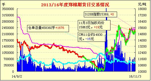 11月4日,隔夜鄭棉CF1701合約下滑,今日早盤慣性下試后在多頭買盤推動下走高,午后多平倉盤與空頭賣盤壓制下回落,日線形成陰線星。日內(nèi)成交量放大,持倉量增加?;久媲闆r:近日北疆石河子、奎屯、博樂等地一些機采棉企業(yè)反映皮棉詢價、銷售基本停滯,雖然從公檢結果來看“雙28”“雙29”甚至“雙30”指標的機采棉比例比較高,適紡性要強于南疆手采棉。但一方面隨近幾日鄭期寬幅振蕩回調,外商、內(nèi)地大型貿(mào)易商拿貨明顯減少,觀望情緒升溫;另一方面由于10月中下旬以來北疆降雨、降溫比較頻繁,皮棉回潮比較大、雜質也相對較高,貿(mào)易商擔心移庫至內(nèi)地交割虧重太大,成生倉單貼水偏高。截至11月初,北疆機采棉收購成本集中在15800-16000元/噸(毛重),但目前棉商、紡織企業(yè)的提貨報價僅15200-15500元/噸,軋花廠仍產(chǎn)銷“倒掛”400-500元/噸,因此賣方也不積極。據(jù)了解,目前奎屯、沙灣等地機采棉的采拾進度已到70%-80%,手采棉稍有落后,預計11月中旬前采摘全部結束。