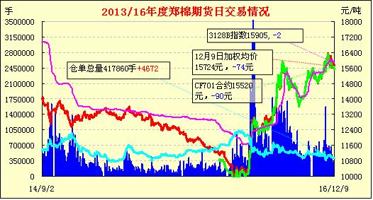 12月9日,隔夜鄭棉CF1705合約反彈回落,今日盤(pán)中窄幅震蕩,日線(xiàn)形成星線(xiàn)。日內(nèi)成交量放大,持倉(cāng)量增加。基本面情況:本周北疆和東疆地區(qū)的軋花廠已基本停收,奎屯和烏蘇地區(qū)尚余幾個(gè)軋花廠在零星收購(gòu),但收購(gòu)量已經(jīng)很少。南疆地區(qū)軋花廠仍在保持收購(gòu),收購(gòu)價(jià)始終維持在7-7.3元/公斤,但多數(shù)軋花廠反應(yīng)末期花質(zhì)量下降,未來(lái)收購(gòu)價(jià)將繼續(xù)走低。