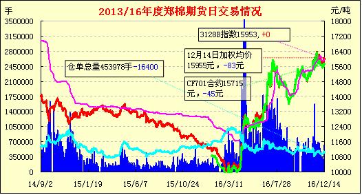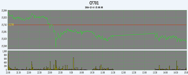 12月14日,隔夜鄭棉CF1705合約盤整后大幅下滑,今日盤中低位震蕩。日內(nèi)成交量萎縮,持倉量減少?;久媲闆r:現(xiàn)貨價格調(diào)整,江蘇等地地產(chǎn)大包價格在15700-16200元/噸,紡廠采購對質(zhì)量要求較高,軋花廠多反映目前部分成本倒掛。湖北等地小包棉3級價格在14600-14900元/噸、4級價格在14200元/噸左右。進入12月后小包棉銷售困難,主要是下游部分小型紡企關(guān)停出現(xiàn)。