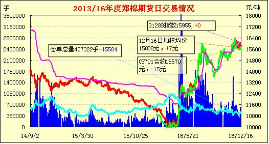 12月16日,隔夜鄭棉CF1705合約沖高下滑,今日盤中震蕩上行,午后在平倉盤打壓下迅速回落,日線形成1/2上影線的小陰線。日內(nèi)成交量放大,持倉量減少?;久媲闆r:本周北疆和東疆收購工作已基本結(jié)束。然而大部分南疆地區(qū)軋花廠仍在保持收購,收購價較前期明顯走低,但也基本維持在7元/公斤以上,多數(shù)軋花廠反應(yīng)收和不收都兩難,因為末期花衣分和斷裂比強(qiáng)度較前期有明顯下降,性價比不高。新疆地方棉每日籽棉收購量集中2.5萬-5萬噸之間,連續(xù)第三周環(huán)比下降,且下降幅度進(jìn)一步增大,但仍明顯大于去年同期,表明今年收購期明顯拉長。