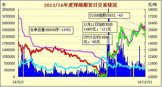 12月21日,隔夜鄭棉CF1705合約探低回升,今日早盤橫向震蕩,尾盤在空頭回補(bǔ)推動(dòng)下迅速拉升,日線形成小陽(yáng)線。日內(nèi)成交量萎縮,持倉(cāng)量減少。棉花現(xiàn)貨銷售一般,部分地區(qū)因霧霾環(huán)保問(wèn)題停產(chǎn),河北滄州等地大包3128級(jí)價(jià)格在15600-15700元/噸,小包3級(jí)在15100-15200元/噸,有滯銷現(xiàn)象,主要為小紗廠關(guān)停及運(yùn)輸受限。