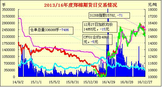 12月27日,隔夜鄭棉CF1705合約下跌,今日早盤在空頭回補(bǔ)推動(dòng)下回升,午間集中回補(bǔ)推動(dòng)期價(jià)重心上移,午后震蕩小幅走高,日線形成小陽線。日內(nèi)成交量萎縮,持倉量減少?;久媲闆r:期貨市場的波動(dòng),對于軋花廠和紡廠,可謂“冰火兩重天”。對于紡廠來說,離3月份國儲(chǔ)棉輪出越來越近,中間還隔著春節(jié)假期,據(jù)了解一些放假較早的紡企1月中旬就將停工。因此只要隨用隨買,備足這段時(shí)間的庫存即可。對于軋花廠來說,雖然新棉報(bào)價(jià)基本不變,但信心受到打擊,銷售壓力明顯增大,一方面是紡企的需求和訂貨熱情極為有限,另一方面是收購成本高,銷售進(jìn)度慢。而且隨著期貨大跌,貿(mào)易商手中的套保棉競爭力明顯提高,導(dǎo)致庫存明顯滯銷。有的老板無奈的表示,本來還想賭行情,現(xiàn)在成了奢望。原本希望在年底前銷售完畢的計(jì)劃已經(jīng)落空,按目前的形勢,明年棉價(jià)大幅上漲的行情可謂“可遇而不可求”。