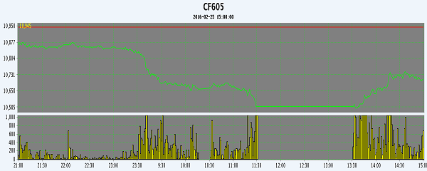 2月25日,隔夜鄭棉盤整,今日早盤CF1605合約下滑,午后創(chuàng)新低,隨后在多頭買盤與空頭回補(bǔ)推動(dòng)下回升,日線形成1/2下影線的陰線;CF1609合約早盤下跌,午后在空頭回補(bǔ)推動(dòng)下回升,日線形成1/2下影線的陰線,日內(nèi)近月成交量放大,持倉量近減遠(yuǎn)增?;久媲闆r:一些疆內(nèi)棉花加工企業(yè)、棉花經(jīng)營商反映,受鄭期各合約連續(xù)大幅跳水(CF1609逼近10000)以及國家將于4月份啟動(dòng)國儲(chǔ)棉輪出的傳言喧囂塵上的影響,棉紡織廠、中間商節(jié)后棉花現(xiàn)貨采購剛一啟動(dòng)就踩了“剎車”,河南、江蘇、山東等地部分用棉企業(yè)雖然因原料庫存偏低亟需補(bǔ)充,但不會(huì)一次性采購很多,采用分批購買、隨用隨買的方式;一些庫存相對(duì)充足的紡企則對(duì)棉企報(bào)價(jià)不理不睬,只觀望不入市。阿克蘇、巴楚幾家棉企表示,由于下游老客戶不詢價(jià)、不報(bào)價(jià),一些高品級(jí)但低品質(zhì)(長度27mm及以下,強(qiáng)力28CN及以下,馬值為C2、C1)的皮棉甚至成為“燙手山芋”,買家不接盤,賣家不知如何報(bào)價(jià),只能等待國儲(chǔ)棉輪出政策明確以后才有可能恢復(fù)活躍。