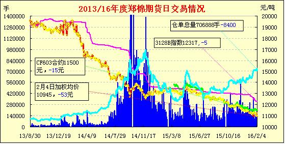 2月4日,隔夜鄭棉盤整,今日CF1605合約減倉下滑,CF1609增倉下跌,日線形成陰線,日內(nèi)成交量萎縮,持倉量近減遠(yuǎn)增?;久媲闆r:現(xiàn)貨市場(chǎng)銷售基本呈現(xiàn)停滯狀態(tài),多地大中型棉紡企業(yè)及棉花經(jīng)營(yíng)企業(yè)多陸續(xù)放假,個(gè)別留守者也基本停止業(yè)務(wù)操作,進(jìn)行最后的年前收尾工作,多數(shù)對(duì)年后抱看淡心態(tài)。價(jià)格方面因無成交,價(jià)格基本延續(xù)前期,疆棉3128級(jí)內(nèi)地庫提貨價(jià)12800-13000元/噸,而地產(chǎn)棉價(jià)格在12500-12800元/噸左右,價(jià)格低位也無人問津。