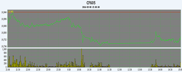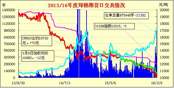 3月8日,隔夜鄭棉沖高調(diào)整,今日早盤CF1605合約在多頭平倉打壓下回落,隨后低位震蕩,日線形成陰線;CF1609合約早盤在多頭平倉打壓下走低,盤中低位減倉,隨后多頭買與空頭回補推動期價回升,日線形成長下影線的陰線。日內(nèi)成交量萎縮,持倉量減少?;久媲闆r:近日鄭棉期貨價格上漲,然而河北省棉花主產(chǎn)區(qū)之一的衡水市現(xiàn)貨市場沒有跟進,棉企、棉商繼續(xù)看空后市的觀念沒有絲毫改變。從3月1日開始,鄭棉期貨各月份合約價格止跌反彈,其中近月合約CF1603、1605、1607最高漲至11000、11180、10590點,最大漲幅均接近或超過600點;主力合約CF1609最高漲至10610點,最大漲幅720點;遠月合約CF1611、1701最高漲至10560、10370點,最大漲幅分別為675和725點。期貨價格上漲雖不能說一舉收復(fù)前期失地,但至少讓棉企、棉商眼前一亮,恐慌心理暫時得以松弛。不過當(dāng)?shù)孛奁?、棉商并未借機調(diào)高現(xiàn)貨銷售報價,仍寄希望于以前期報價盡量壓低庫存。