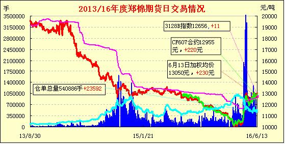 6月13日,早盤鄭棉橫盤,隨后在多頭買盤推動下上漲,尾盤在平倉盤打壓下調(diào)整,日線形成1/2上影線的陽線。日內(nèi)成交量變化不大,持倉量增加?;久媲闆r:山東荷澤東明近日天氣陰雨較多,棉苗長勢良好,普遍出葉10-12片左右,株高40-50cm上下,并有少數(shù)現(xiàn)蕾。據(jù)當(dāng)?shù)氐拿揶r(nóng)反映,由于去年東明棉花收購價格較低,大范圍收購期價格普遍在2.6-3.0元/斤一線,因此今年當(dāng)?shù)孛藁ǚN植面積持續(xù)減少,預(yù)計減幅在10-15%左右。目前當(dāng)?shù)?a href='http://www.qdhqly.cn/News/Channel/?CID=31' title='更多棉花信息' target='_blank'>棉花種植形勢多以“麥棉套種”、“麥瓜棉套種”為主。