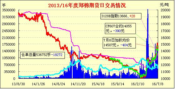 7月11日,隔夜鄭棉下試回升,今日早盤橫向震蕩,午后在多頭買盤和空頭回補(bǔ)推動(dòng)下沖高,日線形成陽線。日內(nèi)成交量維持較高水平,持倉量近減遠(yuǎn)增。基本面情況:山東濟(jì)寧籽棉收購價(jià)格在3.50-3.55元/斤(水分8%,衣分40%),正三級(jí)皮棉出廠價(jià)在13400元/噸一線,雖期貨大漲,但因當(dāng)?shù)厥袌?chǎng)存量不足,行情表現(xiàn)相對(duì)平穩(wěn);棉籽出廠價(jià)在1.58元/斤一線,因貨量不足,棉籽商反映,幾天裝不到一車棉籽。受此影響,當(dāng)?shù)赜兔迯S目前開工者僅兩家,因棉籽原料貨少難收,難以滿足油棉廠持續(xù)開工需求,加工量較大些油棉廠不得已停工歇業(yè)。本周期貨油、粕沖高回落,但因當(dāng)?shù)禺a(chǎn)品庫存不足,對(duì)棉副行情影響不大,油棉廠為彌補(bǔ)高價(jià)原料帶來的損失,對(duì)棉副產(chǎn)品持價(jià)出售。