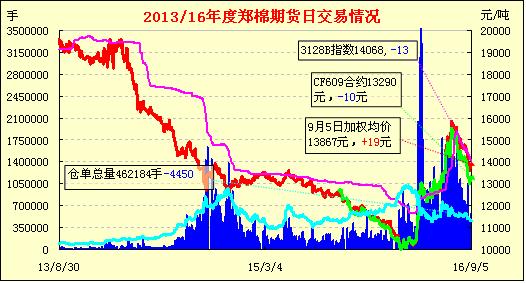 5日鄭棉期貨成交持倉雙減,行情震蕩上行。基本面情況:杭州G20的影響下,下游企業(yè)減停產(chǎn)較多,市場(chǎng)心態(tài)偏弱。就中國現(xiàn)在的情況而言,中國的供給市場(chǎng)充足,且新棉即將大量上市,這勢(shì)必對(duì)棉花價(jià)格有著較大的壓力。8月下旬以來南疆部分棉區(qū)頻繁降雨,受存儲(chǔ)條件和運(yùn)輸工具等限制,很多農(nóng)民“一面采摘,一面交售”,而今年籽棉開秤價(jià)高于2015年同期0.80-1元/公斤,對(duì)農(nóng)民的吸引力也很大。對(duì)于超過6.50元/公斤的收購價(jià)(40衣分),除了已有一些絮棉訂單或皮棉“自產(chǎn)自用”軋花廠外仍積極收購?fù)?,大部分棉企處于觀望、等待狀態(tài),一方面發(fā)行、信用社及其它商業(yè)銀行支持收貸款尚未發(fā)放;另一方面鄭棉期貨及現(xiàn)貨掛牌交易盤面價(jià)格反彈乏力,期現(xiàn)“倒掛”導(dǎo)致棉花加工、經(jīng)營企業(yè)信心不足。