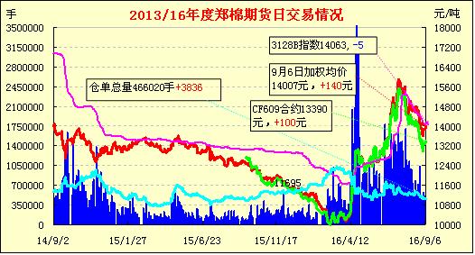 9月6日 增倉放量,重心上移?;久媲闆r:棉花已經(jīng)進(jìn)入到了“金九銀十”的傳統(tǒng)旺季,可棉花市場(chǎng)卻表現(xiàn)不是很積極,顯得萎靡不振。最近,新疆以及黃河長(zhǎng)江流域棉區(qū)成熟較早的棉花已經(jīng)開始陸續(xù)吐絮,少量籽棉上市。前期降雨以及干旱情況,對(duì)新棉采摘進(jìn)度及棉花質(zhì)量略有影響。不過未來一周,國(guó)內(nèi)棉花主產(chǎn)區(qū)基本以晴好天氣為主,溫度適宜,對(duì)棉花的后期生長(zhǎng)較為有利。