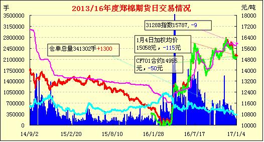 1月4日,隔夜鄭棉CF1705合約下滑,今日早盤在多頭買盤和空頭回補(bǔ)的推動(dòng)下回升,午后窄幅震蕩,日線形成長下影線的陰線星。日內(nèi)成交量放大,持倉量增加?;久媲闆r:目前,距離春節(jié)還有三周的時(shí)間,河北的棉花企業(yè)經(jīng)營現(xiàn)呈兩極分化狀態(tài)。現(xiàn)貨銷售速度有所減緩,行情近幾日保持了弱勢穩(wěn)定態(tài)勢。1月3日,籽棉收購主流價(jià)格在3.70--3.80元/斤(衣分率38%,回潮率13%)。進(jìn)入收購后期,籽棉顏色級有所下降,其他質(zhì)量指標(biāo)較好。據(jù)了解,當(dāng)前棉花企業(yè)收購狀態(tài)截然不同,部分中小型棉企停止了籽棉收購工作,場區(qū)皮棉庫存數(shù)量也較少,但個(gè)別大型棉企則繼續(xù)籽棉收購工作。他們認(rèn)為隨著春節(jié)的臨近,一方面堅(jiān)持收購的棉花企業(yè)數(shù)量逐漸減少。另一方面部分棉農(nóng)有節(jié)前出售籽棉的習(xí)慣。因此,當(dāng)前繼續(xù)收購可適當(dāng)降低收購成本,但日收購數(shù)量呈下降趨勢,企業(yè)收購比較謹(jǐn)慎,對于質(zhì)量較差的籽棉壓低價(jià)甚至拒收。