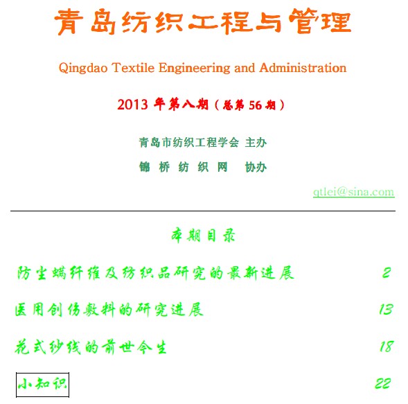 由青島市紡織工程學(xué)會主辦、錦橋紡織網(wǎng)協(xié)辦的《青島紡織工程與管理》電子期刊于2009年1月正式創(chuàng)刊。該刊由青島市紡織工程學(xué)會秦志強(qiáng)工程師任主編。該刊除以電子郵件形式發(fā)送至?xí)T單位外,還在錦橋紡織網(wǎng)開設(shè)專門窗口供業(yè)內(nèi)人士進(jìn)行瀏覽與查閱。該刊的創(chuàng)辦定能為廣大紡織業(yè)技術(shù)人員提供1個技術(shù)交流平臺,為我國紡織業(yè)技術(shù)創(chuàng)新起到積極作用。