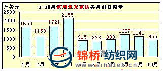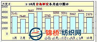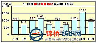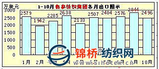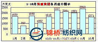 從該10家企業(yè)出口總體情況看,服裝、家紡類企業(yè)出口相對穩(wěn)定或較大幅度增長,棉紡織企業(yè)出口則不同程度下降。如1-10月,魏橋紡織集團(tuán)同比下降40.23%、臨清三和紡織集團(tuán)同比下降26.23%、魯泰紡織股份有限公司基本持平,微增0.93%等。但從棉紡織企業(yè)月度出口額矩形圖上看,自6月份開始,棉紡織企業(yè)出口業(yè)績開始出現(xiàn)穩(wěn)步提升跡象,在情況稍見好轉(zhuǎn)的同時,10月份又出現(xiàn)不同程度回落。該10家企業(yè)前10個月的月度出口圖示如下(按出口額大小排列):