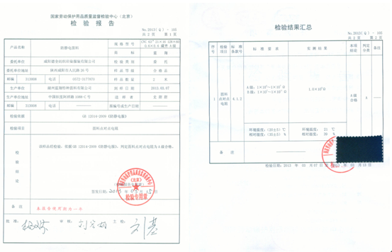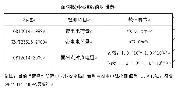 近日,藍(lán)翔防靜電職業(yè)安全防護(hù)面料在產(chǎn)品性能和穩(wěn)定性上又上了一個(gè)新臺(tái)階,經(jīng)國(guó)家勞動(dòng)保護(hù)用品質(zhì)量監(jiān)督檢驗(yàn)中心檢測(cè),面料點(diǎn)對(duì)點(diǎn)電阻實(shí)測(cè)結(jié)果1.0×105Ω,符合GB12014-2009《防靜電服》A級(jí)標(biāo)準(zhǔn)1.0×105~1.0×107Ω標(biāo)準(zhǔn)。