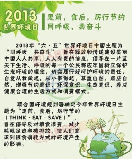 6月5日,世界環(huán)境日。1972年6月5日,聯(lián)合國在瑞典首都斯德哥爾摩舉行了第一次人類環(huán)境會議,通過了《人類環(huán)境宣言》及保護全球環(huán)境的“行動計劃”,并正式將6月5日定為“世界環(huán)境日”。今年環(huán)境日的主題是“思前,食后,厲行節(jié)約”,旨在倡導反對糧食浪費,減少耗糧足跡和碳排放,使人們意識到糧食消耗方式對環(huán)境產(chǎn)生的影響?!   ?/p>