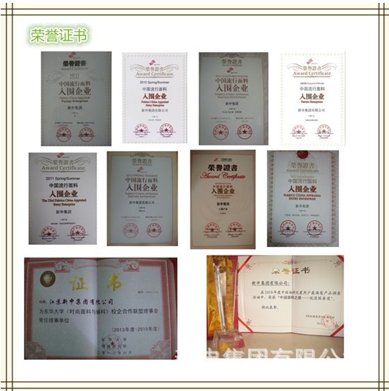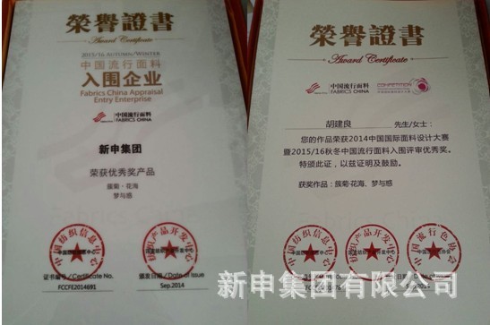 新申集團(tuán)有限公司首席面料設(shè)計(jì)師胡建良先生研發(fā)、設(shè)計(jì)的“簇菊花海”與“夢與惑”兩款亞麻面料產(chǎn)新品成功入圍“2015/16秋冬中國流行面料”。同時(shí),新申集團(tuán)榮獲了“2014春夏中國流行面料入圍企業(yè)”稱號。作為上游面料企業(yè),新申亞麻主營亞麻面料的設(shè)計(jì)研發(fā)生產(chǎn)和銷售。由于新申亞麻能為客戶提供從色彩到亞麻面料及成品的解決方案,使得新申亞麻已超越僅僅作為亞麻面料供應(yīng)商提供產(chǎn)品的層面,而成長為品牌離不開的戰(zhàn)略合作伙伴。