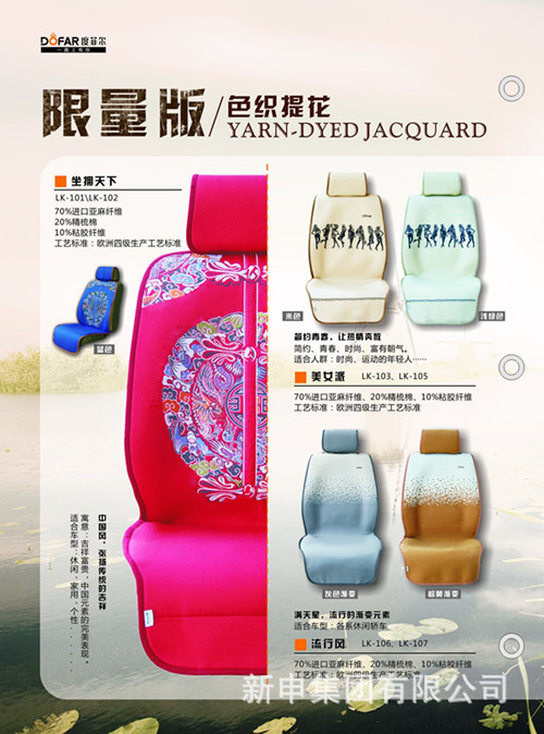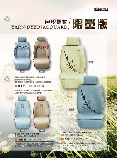 私家車的普及使得人們開始關注車內(nèi)空間綠色、安全和舒適。而車墊、車套等成為私家車舒適內(nèi)裝飾的重要物品。綠色、天然、環(huán)保的汽車坐墊成為時下人們最佳的選擇,綠色亞麻作為一種純天然的植物纖維,以其純天然、吸汗透氣、抑菌、阻燃等無公害的屬性而受到車主們的青睞,也成為高端車載市場上珍貴的綠色產(chǎn)品。說到100%純亞麻,作為有著20多年