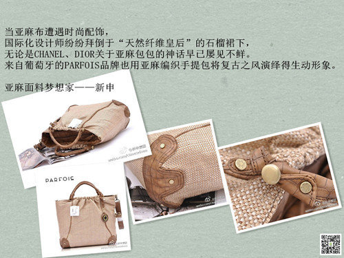 大到手提箱,旅行箱;小到手袋,手提包甚至錢包,亞麻布都成為最具環(huán)保時尚價值的最佳生活方式設計。天然纖維皇后用一種無聲的時尚話語權向歐洲人表達著來自自然的健康、舒適的善意!百年愛馬仕、LV,還是尋常生活環(huán)保袋、手提袋,亞麻布所制成的包包被歐洲人認為是一種幸福而純粹的自然生活方式的象征:徜徉于阿爾卑斯山麓,呼吸于諾曼底的清新,在無界的時尚中享受最具自然的生活狀態(tài),一直傳數百年至今。