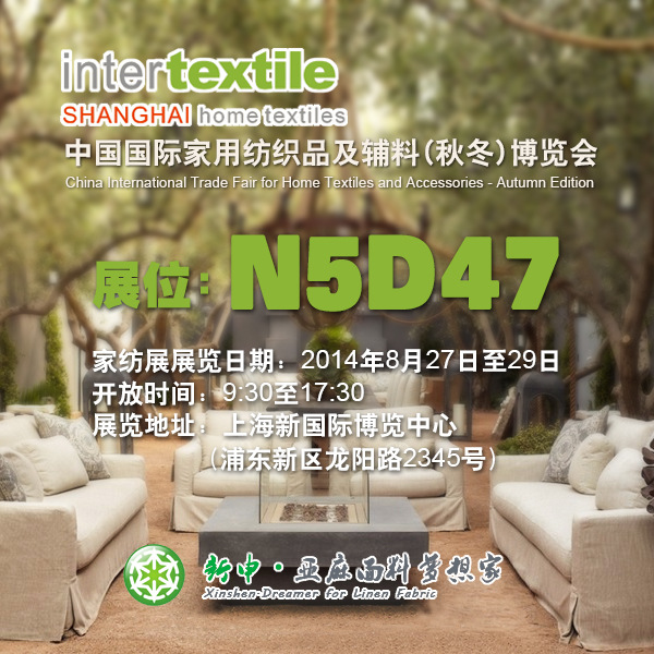 2014新申亞麻,尋找更多夢想同行者第一站。與您相約8月27-29日“中國國際家用紡織品及輔料(秋冬)博覽會”上海新國際博覽中心N5館D47展位。一起攜手“小而美,大而全”的綠色亞麻面料夢想新世界,新申亞麻期待更多夢想家的光臨。 轉(zhuǎn)載本網(wǎng)專稿請注明:"本文轉(zhuǎn)自錦橋紡織網(wǎng)"。