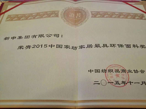 新申亞麻榮膺“2015中國家紡家居最具環(huán)保面料獎”